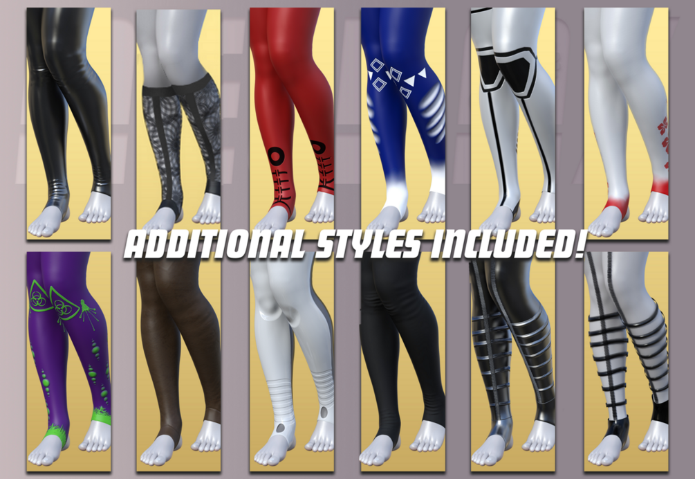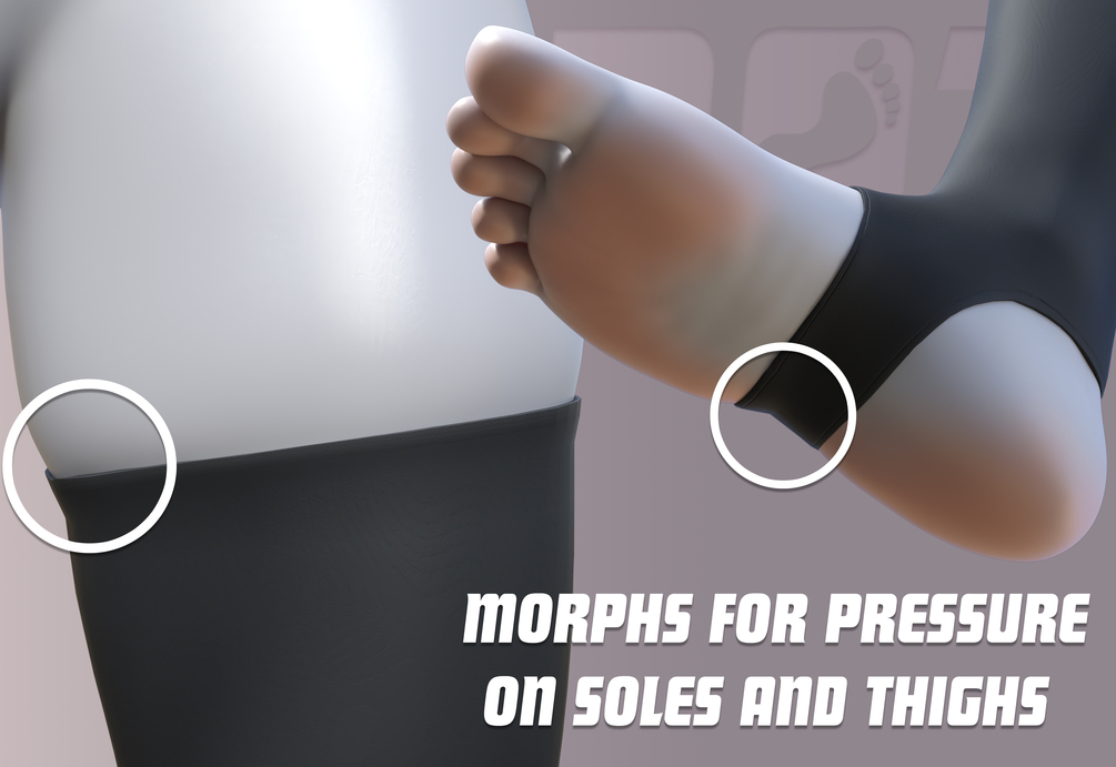 You will get 1 Stirrups Clothing Item, a Front Arch Wrap Accessory, Heel Cover Sock Accessory, and Multiple textures and morphs for each.